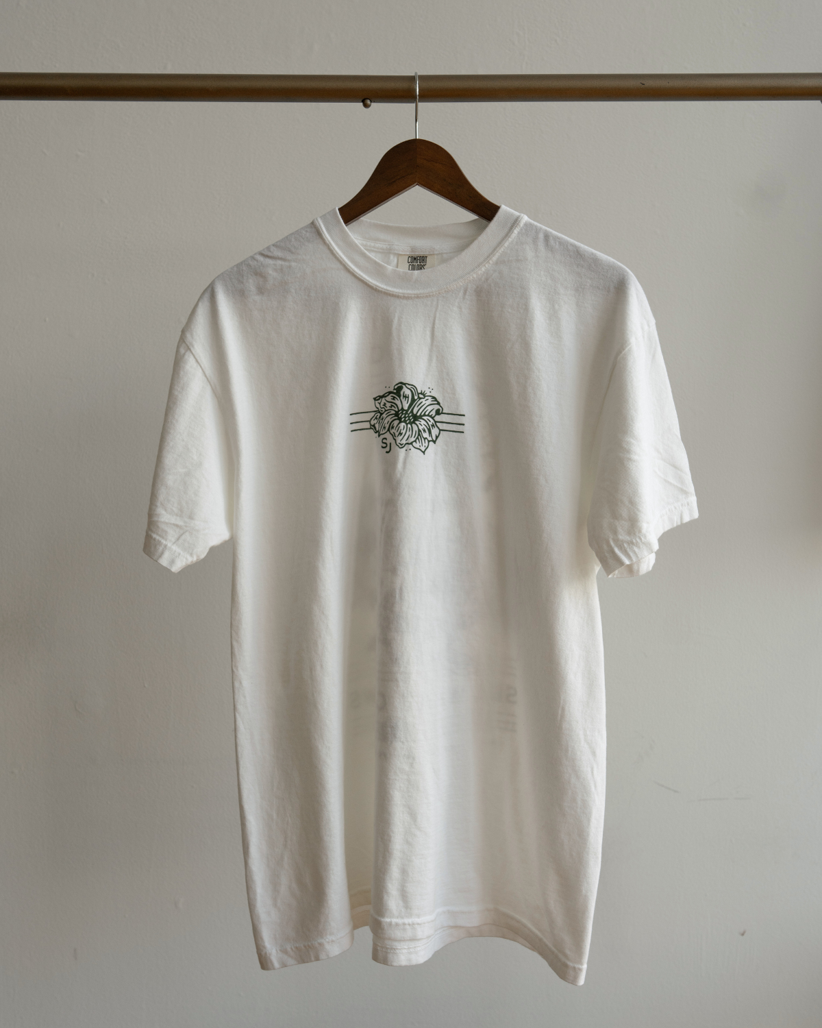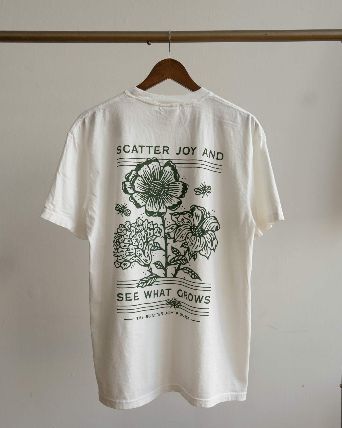 Every year on Earth Day, we release one shirt. This is it for 2026. The See What Grows T-Shirt is printed on a white Comfort Colors base—a small SJ floral mark on the front chest, and a full botanical illustration on the back: wildflowers, bees, and the words "Scatter Joy and See What Grows" in forest green. It's a reminder that what you put into the world has a way of coming back.
