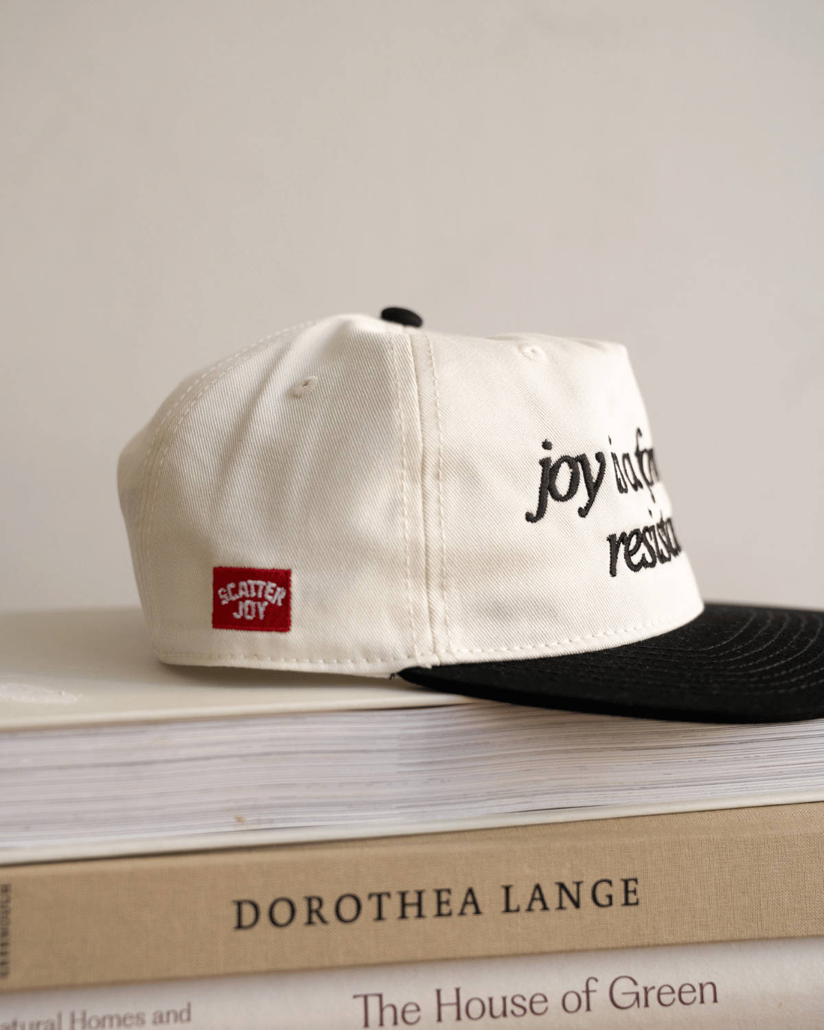The Joy is Resistance 5-Panel features our signature "Joy is a Form of Resistance" embroidered across the front panel in a classic two-tone colorway—cream body, black brim. The red Scatter Joy tag on the side marks this as part of the Red Tag Collection.